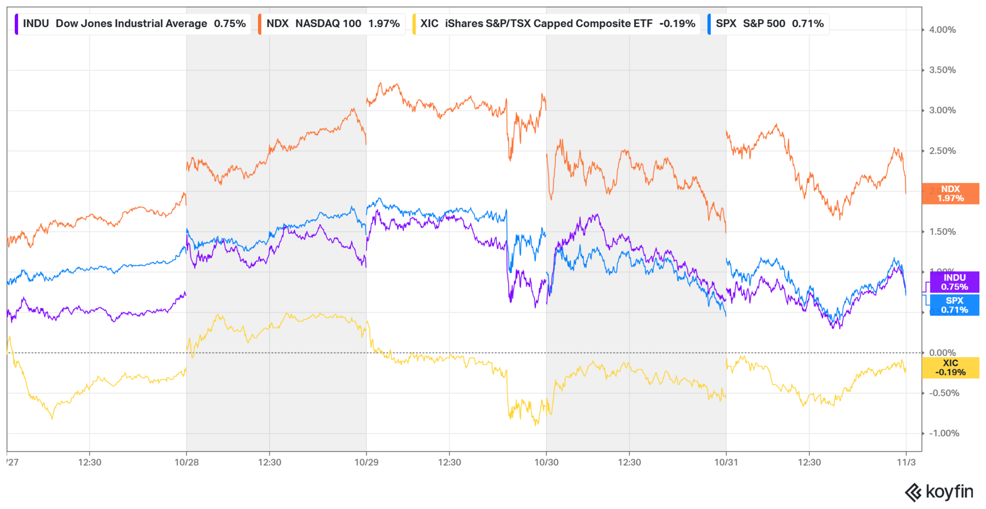 The Nasdaq 100 led the way, up 1.97%. The S&P 500 and Dow Jones followed with gains of 0.71% and 0.75%, respectively and the TSX slipped 0.19% for the week.