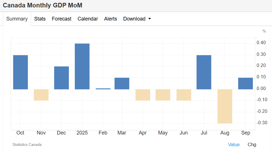 That 0.1% GDP gain in September is weak, but I do think it’s important to keep it in context. We’ve had months of trade tension and sluggish energy output, so even small growth shows at least some resilience. I see this as the early stage of a “slow and low” phase, not a deep downturn, but not much excitement either. What matters now is whether new U.S. tariffs and global supply shifts drag the economy down further, or if domestic demand and retail spending keep the floor under growth. Either way, it’s pretty obvious that Canada’s economic story is shifting from fighting inflation to growth recovery, although no doubt it will be tough sledding.