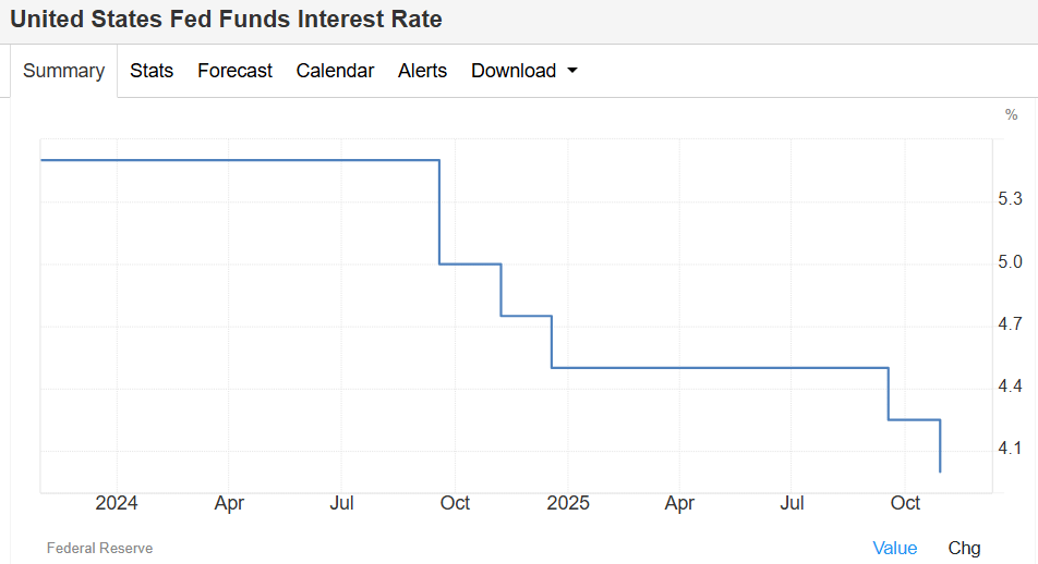 The Federal Reserve also lowered the funds rate by 25bps on Wednesday, to 3.75–4.00%, a continuation of its cautious easing stance.