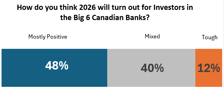 In last week’s poll, I asked how readers think 2026 will play out for investors in the Big 6 Canadian banks. Nearly half expected a mostly positive year, while 40% leaned toward a mixed outcome and a smaller group anticipated tougher conditions. It was a fairly balanced split, si it looks like most people see opportunity but still recognize the uncertainty ahead. Thanks to everyone who voted.