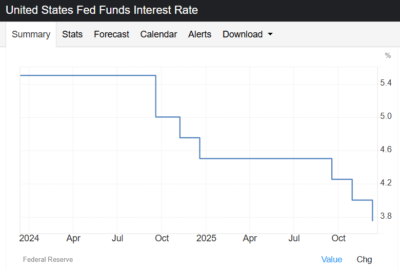 The Federal Reserve lowered the federal funds rate by another 25 basis points to 3.5 to 3.75%, its third cut in four months, bringing borrowing costs to their lowest level since 2022.